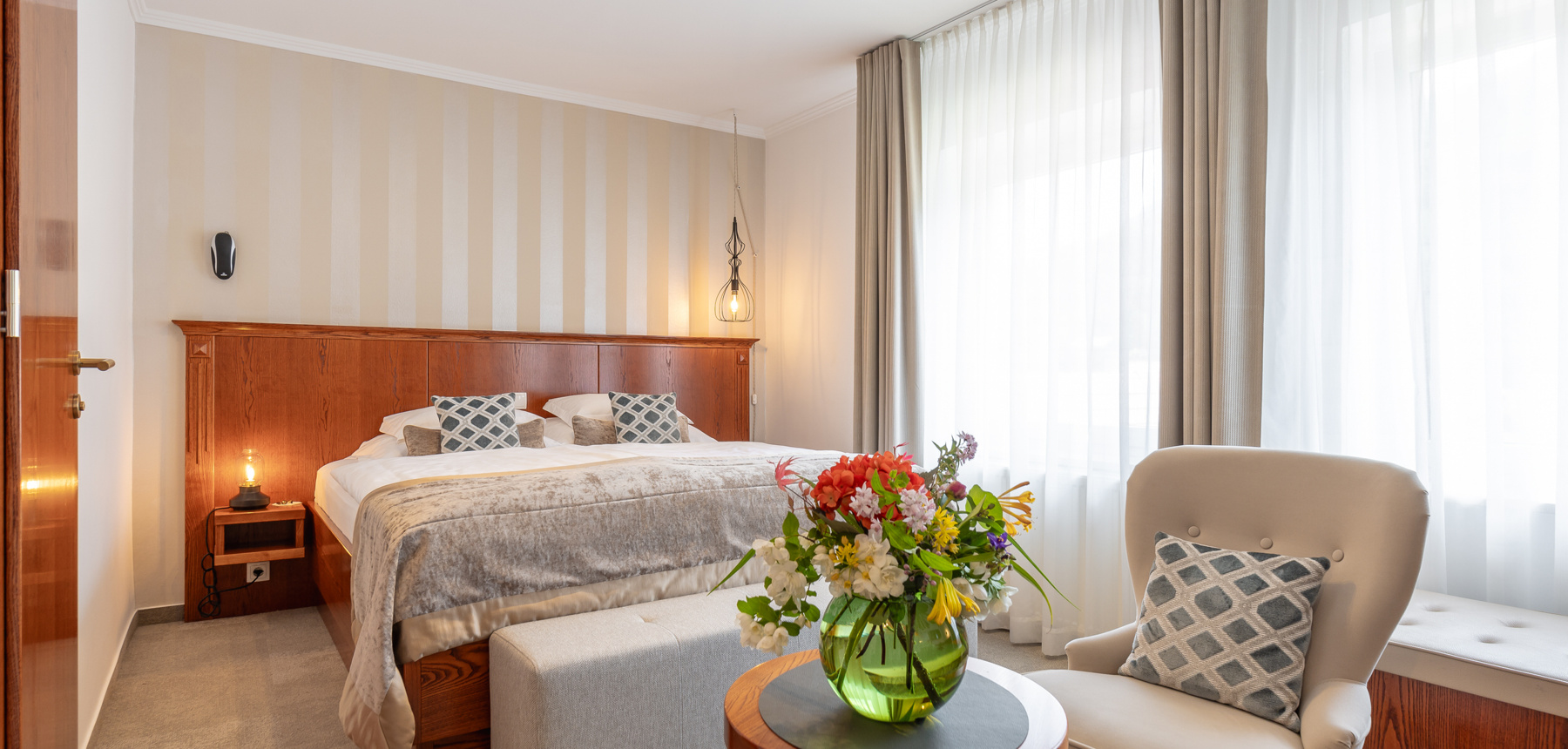 La camera doppia standard è arredata nel tipico stile alpino con un tocco di ...
